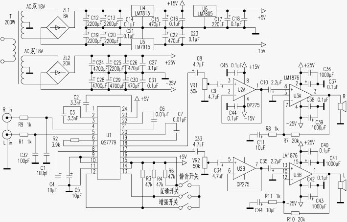 本电路相当简洁,音效处理采用加拿大QSOUND公司的单片QS7779虚拟环绕电路。由于该电路内置了杜比定向逻辑和杜比数码混合信号解码器。不仅能使普通的立体声信号进行效果增强,当播放的是DVD的杜比数码信号时也能够先解码,然后再进行矩阵运算,虚拟化为二声道输出,另外还可以通过开关来切换不同的效果。有关该电路的使用效果和音质在音响界已有定论,比起那些形同虚设的“3D环绕”更实在。本电路的缓冲级仅用了一片OP275用于改善经过音量电位器之后的输入和输出阻抗。该款运放用在此处可以增强对末级的驱动力,减小前、后级之间在大动态下的相互影响。末级功放选用的是闻名发烧界的LM1876TF,该IC出自美国NS公司,转换速率达18μV/ms、信噪比达92dB,其静态电流只有4mA。由于集成了两路完全独立的声道,共用一块散热片,保证了电路具有较高的分离度和相同的温度特性。该IC输出功率为25W,用在听音环境不大的小型多媒体有源系统中再好不过了。该功放外围元件数量少,每声道仅有8只,所以很容易制板并对现有的多媒体音箱进行改造。