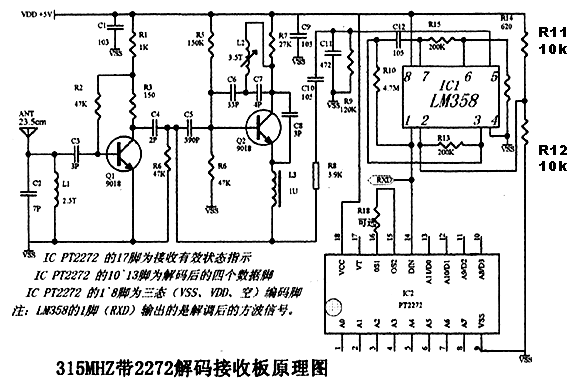 接收模块采用SMD贴片工艺制造生产,为超再生接收方式,它内含放大整形及解码电路,使用极为方便。 接收板A-L4 超再生锁存型长方形接收板: (15元一个) 超再生接收模块有七个引出端,分别为10、11、12、13、GND、17、VCC,其中VCC为5V供电端,GND为接地端, 17端为解码有效输出端,10、11、12、13是解码芯片PT2272(SC2272)集成电路的10~13脚,为四位数据锁存输出端,有信号时能输出5V左右的高电平,驱动电流约2mA,与发射器上的四为个按键一一相对应。 接收板A-L4用途最广泛,所以默认供货时供这款。 接收板A-M4 超再生非锁存型长方形接收板:(15元一个) 接收板A-M4和L4的区别在于输出的数据是非锁存的,有遥控信号是数据脚是高电平,遥控信号消失时数据脚立即恢复为低电平。 接收板A-T4 超再生触发翻转型长方形接收板:(16元一个) 接收板A-T4是新开发的产品,它的数据脚能实现触发翻转工作逻辑,也就是按一下遥控器A键,接收板的第10脚变成高电平并保持,再按一下遥控器A键,接收板的第10脚变成低电平并保持。 超再生接收板从外形上区分还有长方形接收板和正方形接收板,长方形的接收板和主板是垂直焊接的,接收板建议放在主板的边缘,并且尽量远离大的金属物体,正方形的接收板和主板是水平焊接的。客户可以根据实际需要选用最适合的接收板。 正方形的接收板 可以分为L4和M4两种,请客户购买是明确说明。 接收板ZA-L4 超再生锁存型正方形接收板: (15元一个) 接收板ZA-M4 超再生非锁存型正方形接收板: (15元一个) 超外差系列 超外差接收机价格较高,温度适应性强,接收灵敏度更高,而且工作稳定可靠,抗干扰能力强,产品的一致性好,接收机本振辐射低,无二次辐射,性能指标好,容易通过FCC或者CE等标准的检测,符合工业使用规范 超外差接收板左侧的ANT是天线端,旁边的GND为天线地端,最好能配接特性阻抗为50欧姆的天线,也可以用一根30厘米长的导线直接接到ANT端替代天线。 RX3310A是台湾HMARK公司生产的专门用于幅度键控ASK调制的无线遥控及数传信号的接收集成电路,内含低噪音高频放大、混频器、本机振荡、中频放大器、中频滤波器、比较器等,为一次变频超外差电路,双列18脚宽体贴片封装,主要技术指标如下: