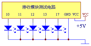 通常超再生接收机的灵敏度约-106DBM,所用器件多,稳定性差,加工复杂,而使用RX3310A的超外差接收机灵敏度可达-102DBM,而且外围元件少,集成化程度高,适合大规模生产。超外差接收机有声表稳频和LC稳频的两种,采用LC稳频的灵敏度高可达-104DBM,但是稳定性稍差,而声表稳频的灵敏度约-102DBM,稳定性好,这里提供的超外差接收机都为声表稳频的。 接收板B-L4 超外差插针式锁存型接收板:41x24x6毫米(25元一个) 接收板B-M4 超外差插针式非锁存接收板:41x24x6毫米(25元一个) 应用举例 发射手柄上设置有四个按键,当按动时发射机上的按键,发射电路会被激活而进入发射状态,发射机静态时不耗电。机内装配的电池只被用于点发射状态。当用于报警设定和电器开关时,每节电池一般可用到一年以上,电池的容量为45mAH。 我们为了测试遥控模块工作是否正常,可以在接收模块的VCC和GND端加一个5~6伏的直流电压,也可以通78L05三端稳压芯片稳压获得5伏稳压工作电源,在10、11、12、13、17端分别对地接一个发光二极管(发光二极管负极接地)这里提供的遥控模块的接收机都是锁存型的,也就是说能够保持遥控信号的瞬间状态,假设我们按动发射机的A按键时,与其对应11路的LED即可发光,松开发射机的A按键,11路的LED仍然点亮处于自保持状态(锁存),直到按动其它的按键如B键时,11熄灭而12处的LED点亮。17端是解码有效输出端,不论按动发射机的哪一个按键,只要解码成功即17端变成高电平,直到发射机停止发射。 用途:用于遥控一个电路的开和关,或者一盏灯的亮与灭。