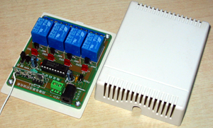 这是我们新开发的多用途四继电器遥控接收板,可以和网站介绍的100米四键遥控器、200米四键遥控器、800米四键遥控器、2000米四键遥控器等配合使用。 这款接收板上有4个大电流继电器,对应发射机的4个按键,还有一个2位的跳线柱,用于切换选择锁存或者非锁存模式。所谓锁存模式就是按下A键,接收板的A继电器吸合并保持,只有按下B/C/D中的任意一个按键时,A继电器才释放,按下的那路继电器吸合,也就是说接收板能记忆上次遥控的状态,并且能够自锁保持,直到接收到下次的遥控指令才改变继电器的状态。所谓非锁存模式就是按下A键,接收板的继电器吸合,如果松开A键,接收板的继电器立即释放。 这款接收板非锁存模式也是采用脉冲展宽抗干扰技术的,所以遥控稳定、距离远。 接收板4J-T4 瞬态触发翻转型四继电器遥控接收板(接收板38元一个,不含外壳) 通过将芯片换成2272 T4芯片并且选择锁存模式,可以使接收板工作在触发翻转模式,它可以独立控制四个通道,并且互相之间不会影响。例如:按一下遥控器上的A键,A通道对应的继电器吸合并保持,再按一下A键,继电器释放,其它通道工作过程相同。(注意:必须切换到锁存模式才能正常工作)