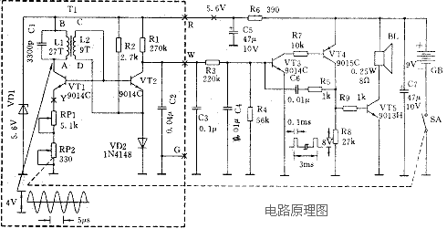 由三极管VT1和高频变压器T1等组成,是一种变压器反馈型LC振荡器。T1的初级线圈L1和电容器C1组成LC并联振荡回路,其振荡频率约200kHz,由L1的电感量和C1的电容量决定。T1的次级线圈L2作为振荡器的反馈线圈,其“C”端接振荡管VT1的基极,“D”端接VD2。由于VD2处于正向导通状态,对高频信号来说,“D”端可视为接地。在高频变压器T1中,如果“A”和“D”端分别为初、次级线圈绕线方向的首端,则从“C”端输入到振荡管VT1基极的反馈信号,能够使电路形成正反馈而产生自激高频振荡。振荡器反馈电压的大小与线圈L1、L2的匝数比有关,匝数比过小,由于反馈太弱,不容易起振,过大引起振荡波形失真,还会使金属探测器灵敏度大为降低。 振荡管VT1的偏置电路由R2和二极管VD2组成,R2为VD2的限流电阻。由于二极管正向阈值电压恒定(约0.7V),通过次级线圈L2加到VT1的基极,以得到稳定的偏置电压。显然,这种稳压式的偏置电路能够大大增强VT1高频振荡器的稳定性。为了进一步提高金属探测器的可靠性和灵敏度,高频振荡器通过稳压电路供电,其电路由稳压二极管VD1、限流电阻器R6和去耦电容器C5组成。 振荡管VT1发射极与地之间接有两个串联的电位器,具有发射极电流负反馈作用,其电阻值越大,负反馈作用越强,VT1的放大能力也就越低,甚至于使电路停振。RP1为振荡器增益的粗调电位器,RP2为细调电位器。