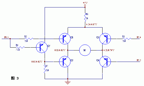 但此电路的Q1和Q3需要分别控制,所需控制引脚较多。如果要用一个IO脚控制则可以加一个反相器。但此电路的Q1和Q3需要分别控制,所需控制引脚较多。如果要用一个IO脚控制则可以加一个反相器。如图3所示。图中标有各点实测电压值。