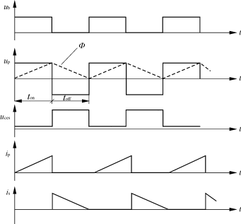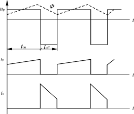 图2中ub为Vp的控制电压波形;up为变压器初级Np电势波形;φ为变压器磁通变化波形;uces为V7集电极电压波形;ip、is为初、次级电流波形。 2)toff>τ各参数波形如图3所示。从图3中可以看出磁通复位时V7关闭还持续一段时间,ip呈线性上升,is线性下降。