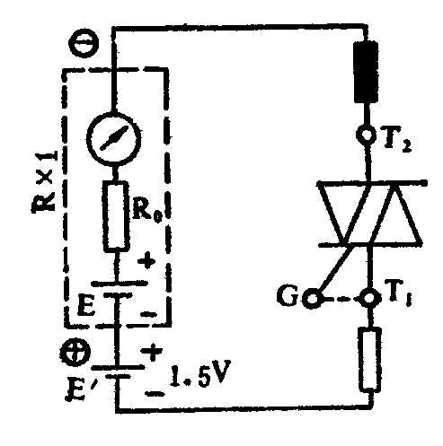 以500型万用表R×1档为例,将E′接在万用表“+”插孔与红表笔之间,这时总电压E+ E′=3V。该电阻档的欧姆中心值R0=10Ω,改装后的短路电流I′M=(E+ E′)/ R0=3V/10Ω=300 mA,实际可提供100 mA左右的测试电流。图1中的虚线表示在测量时T1极与G 极可以短路,也可以开路。具体检查步骤见5.9.7。