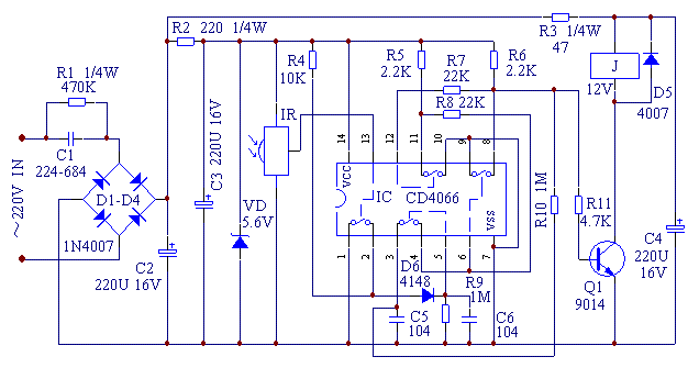 电路原理: 220V的交流市电经C1、R1降压,D1-D4整流得到12V左右的直流电,经C2滤波R2限流后再经VD稳压,C3滤波后得到稳定的5.6V直流电给红外线接收头和控制级供电。IR为红外线接收头,内部集成了红外线接收、放大、解调电路,当接收到遥控信号时,输出端输出低电平.主要控制电路由四双向模拟开关IC4066组成,功能引脚如下:
